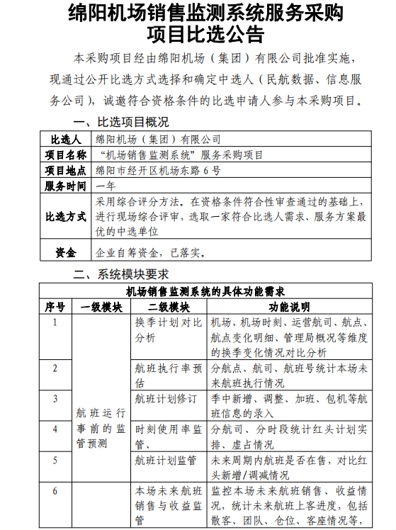 綿陽機(jī)場銷售監(jiān)測系統(tǒng)服務(wù)采購項(xiàng)目比選公告